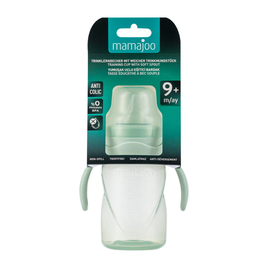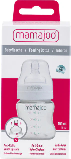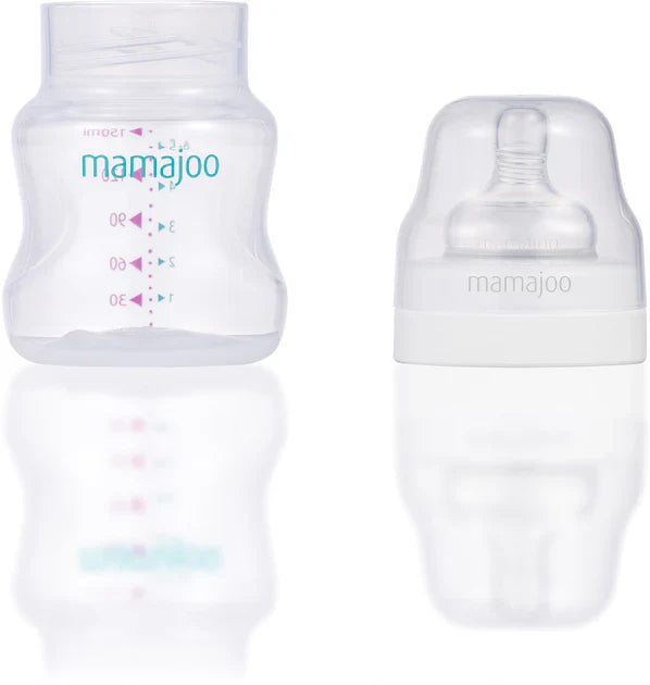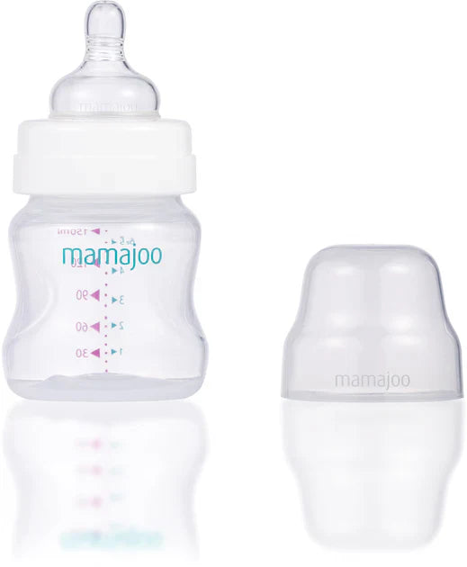 The cap of Mamajoo bottles tightly closes the nipple, providing a complete seal and preventing leakage. The scale markings on Mamajoo bottles allow you to track how much milk your baby has drunk.