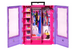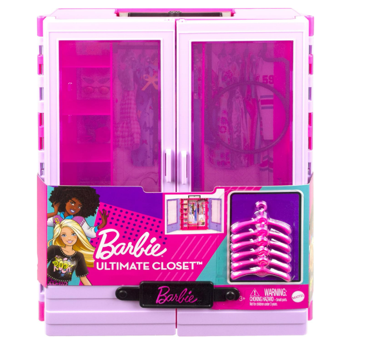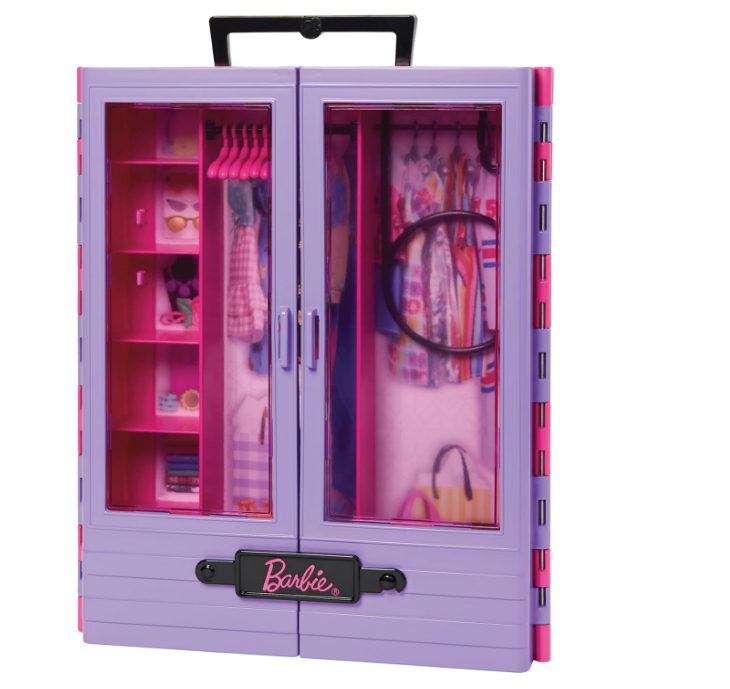 Pack Barbie doll for a world of possibility! The Barbie Ultimate Closet is designed for portability with a carrying handle. Decorated with Barbie signature style, the closet features a purple exterior with a pink interior and translucent doors for a peek into the wardrobe. Six included hangers help keep fashions organized and tidy and lots of shelf space is perfect for the amazing accessories (not included). A fold-out rack is used to hang clothes and is handy for dress-up style changes. Closet can also store a doll (not included). The easy carrying handle keeps the portable closet ready to travel, anywhere, for any occasion.