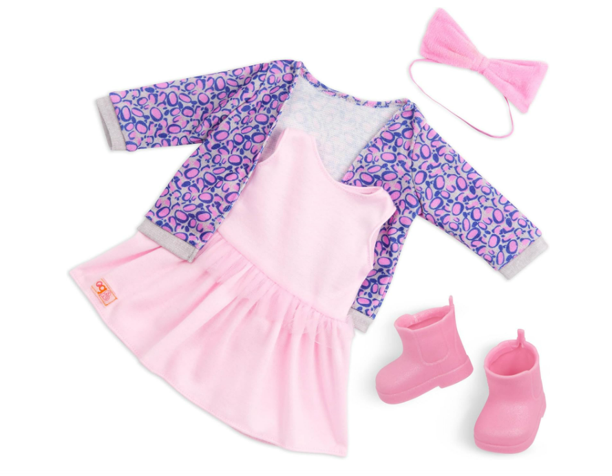 • Stylish Outfit: The doll is dressed in a trendy pink dress with a white top, paired with a purple leopard print cardigan and pink socks.