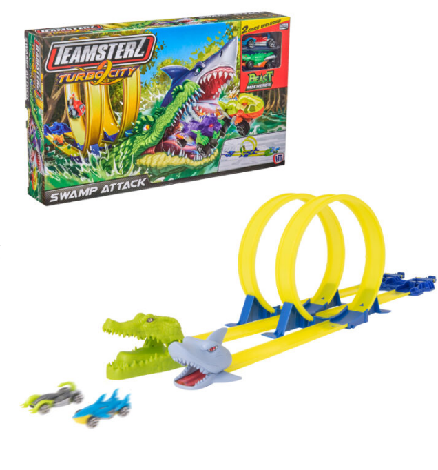 Speed down the track and through the animal jaws with the Teamsterz Turbo City Swamp Attack Track Set With 2 Beast Machines Cars. Launch your cars down the dual track with the elastic band launcher and watch as the cars zoom around the loop then jump through the dragon and crocs open jaws. Race your friends and see which Beast Machines is the fastest. The Beast Machines cars included are approximately 3-inch scale and feature high-quality die-cast details with independent free-moving wheels. Aiding the development of your little one’s cognitive and fine motor skills, this is the perfect size for push along play. The Turbo City Swamp Attack track set is the perfect gift for any enthusiastic little driver, offering hours of imaginative play. The animal head pieces are interchangeable, and the playset is compatible with other Teamsterz track sets and 3-inch die-cast cars for broader play. Suitable for ages 3 years +.