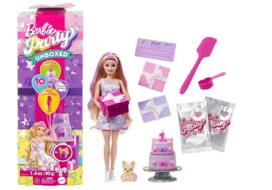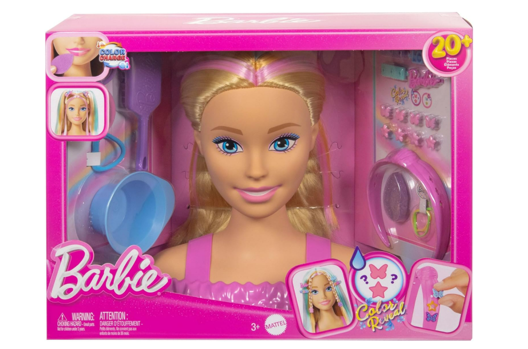 Become a hair expert with this colorful Barbie doll styling head. Barbie has blonde hair with bright pink, orange, and turquoise streaks throughout! Including a bowl and sponge to help with color changes, Barbie can make her hair clips match her colorful hair. Her other colorful accessories, like a hairbrush, hair ties, and clips, help kids bring their artistic vision to life! This styling head makes a great gift for children ages 3 and up! Colors and decorations may vary.