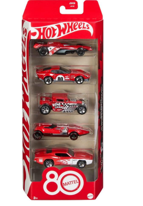 Put the turbo in your Hot Wheels collection and celebrate Mattel's 80th birthday with the 1:64 scale Cars 5 set. Featuring classic Hot Wheels vehicles like the Bone Shaker and Twin Mill, the set is enhanced with authentic details and special 80th-anniversary decorations. It comes in a collectible package to celebrate this milestone and allow fans to play with or display the vehicles. Colors and decorations may vary.