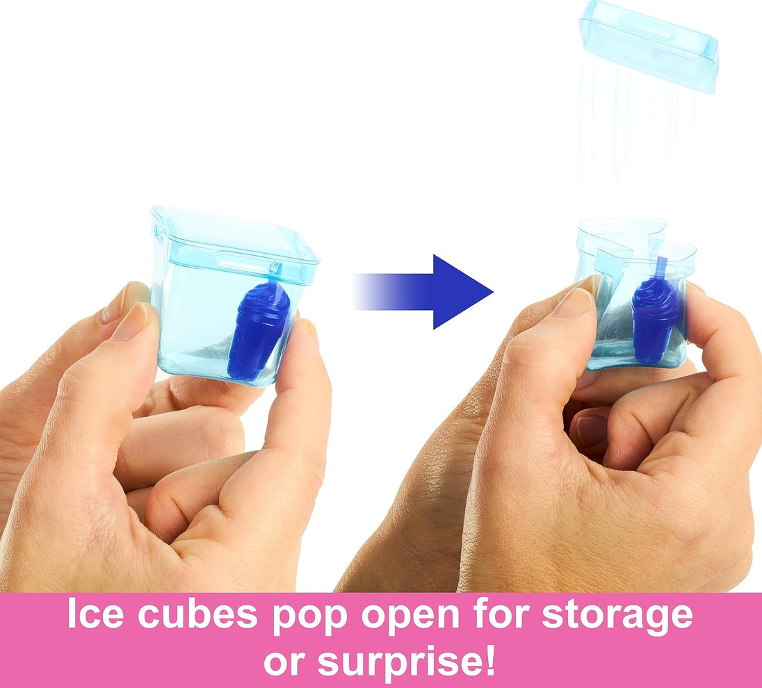 Discover additional pieces inside the ice cubes that really "pop" open, like a squishy mini-drink and roller-skates for Barbie® doll -- use for storage or repeat reveals!