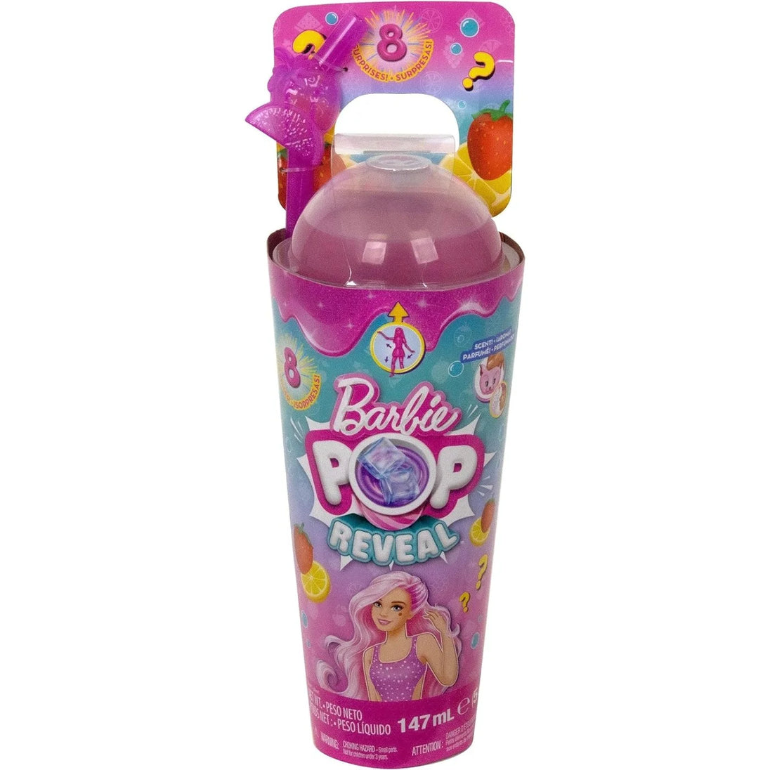 Barbie® Pop Reveal™ dolls offer an unboxing experience filled with eight sensory surprises! Which doll will you reveal? Unwrap the drink cup-inspired packaging to find one of four flavors in the Fruit Series -- strawberry lemonade, fruit punch, watermelon crush or grape fizz. Open the lid and remove the surprise bags, then pop the top and watch colorful Slime™ drip down over the ice cubes that hold accessories inside. Kids can take the squishy Slime™ out for fun, sensory play. Next, pop the ice cubes to find roller skates and a squishy mini-drink piece. The ice cubes are reusable -- repeat the pop reveal fun again and again! Kids keep unboxing to find a fruit-scented fashion doll, a squishy and scented pet, fashion piece and accessories. Each Pop Reveal Barbie™ doll is posable with color-change hair and makeup. Kids will want to collect them all! Each doll sold separately, subject to availability. Dolls cannot stand alone. Colors and decorations may vary.