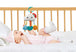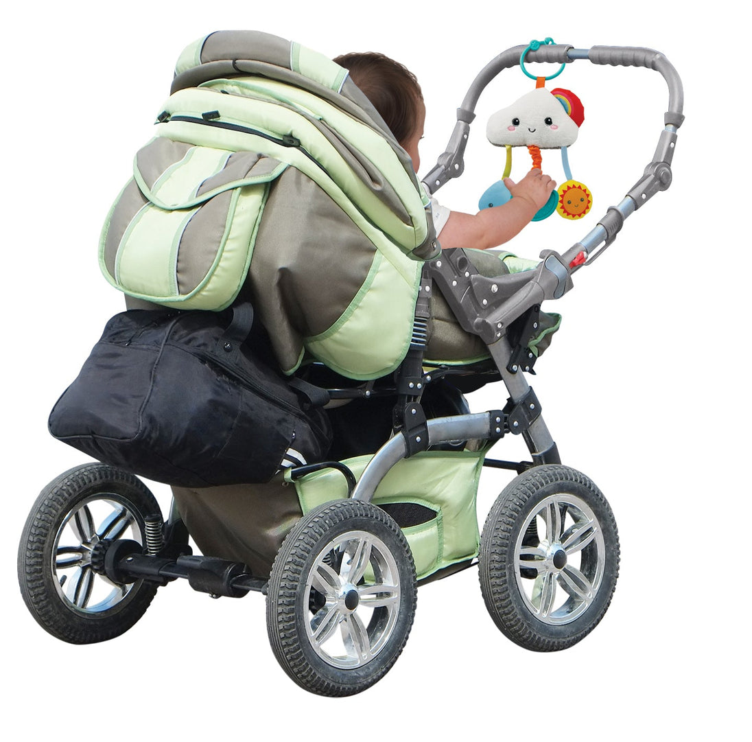 - Plastic ring easily attaches to stroller or car seat for take-along fun