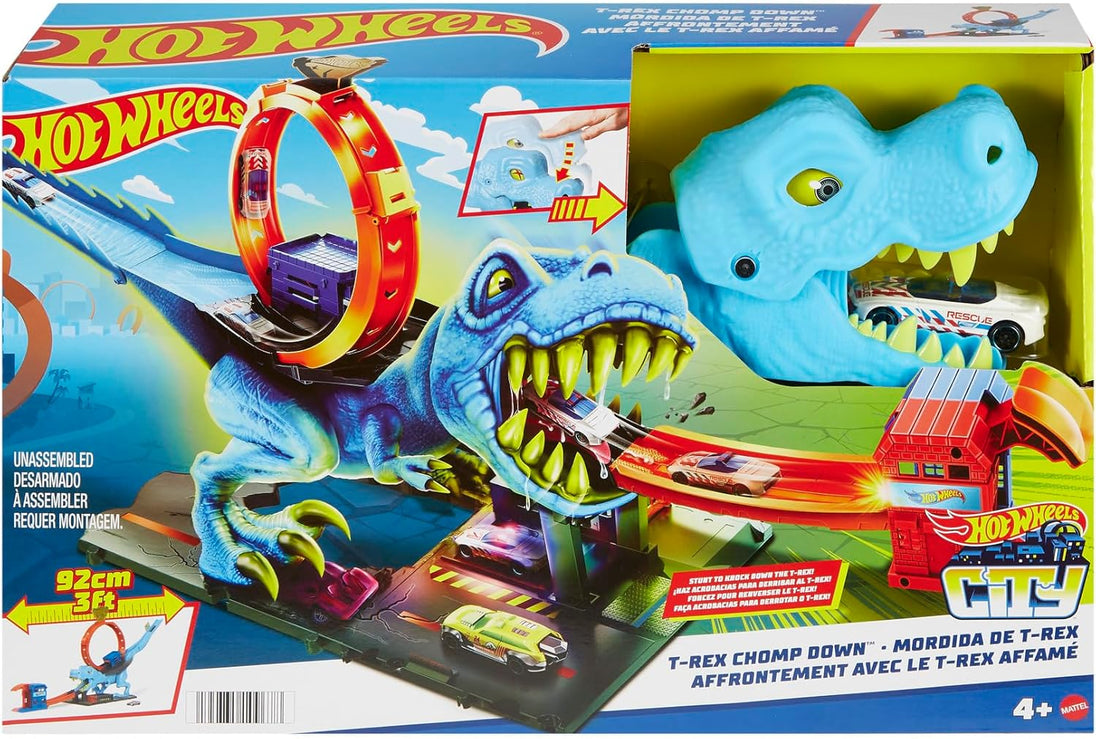 Knock out the dinosaur and save the day in the Hot Wheels City T-Rex Chomp-Down Playset. It features a slam launcher and 9-inch loop where kids launch their Hot Wheel cars just right to defeat the beast. When the dino gets knocked out, its eyes transition from angry yellow to knock-out X-es. Includes one Hot Wheels vehicle and connects to other sets. It's geared toward kids 4 years old and up. Colors and decorations may vary.